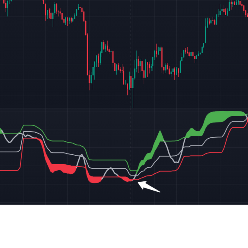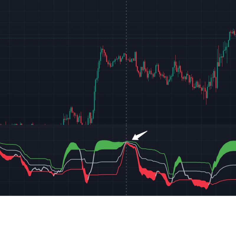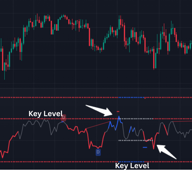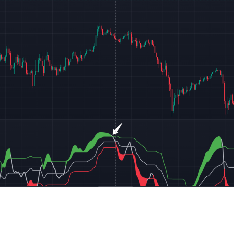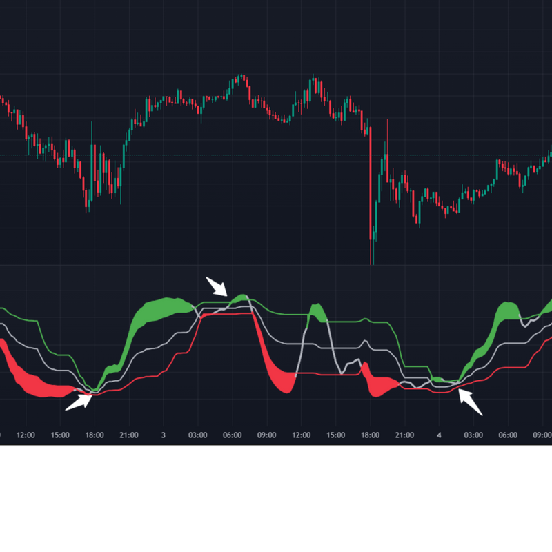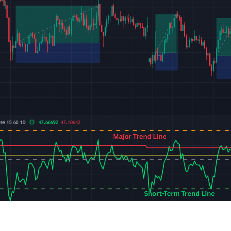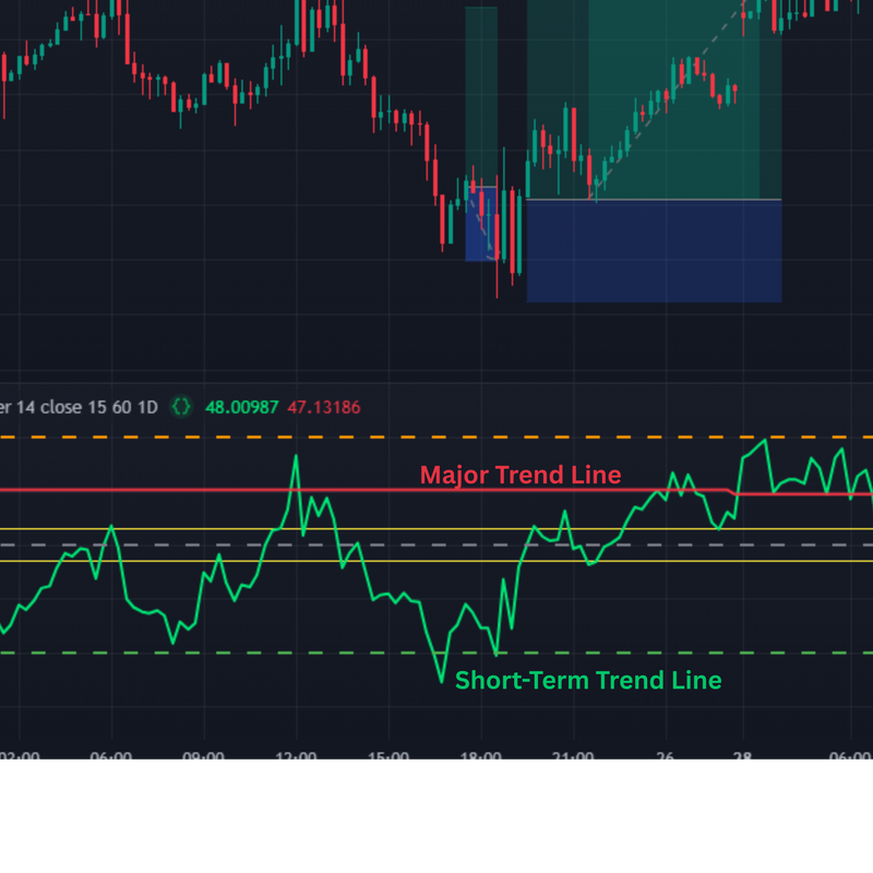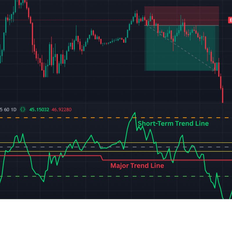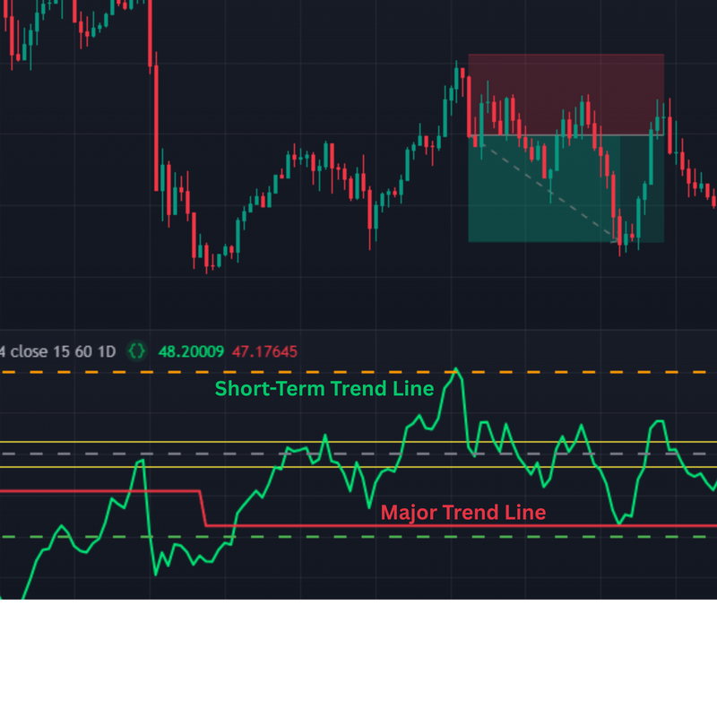 When the major trend is down and the short-term line signals overbought, it suggests a sell opportunity.